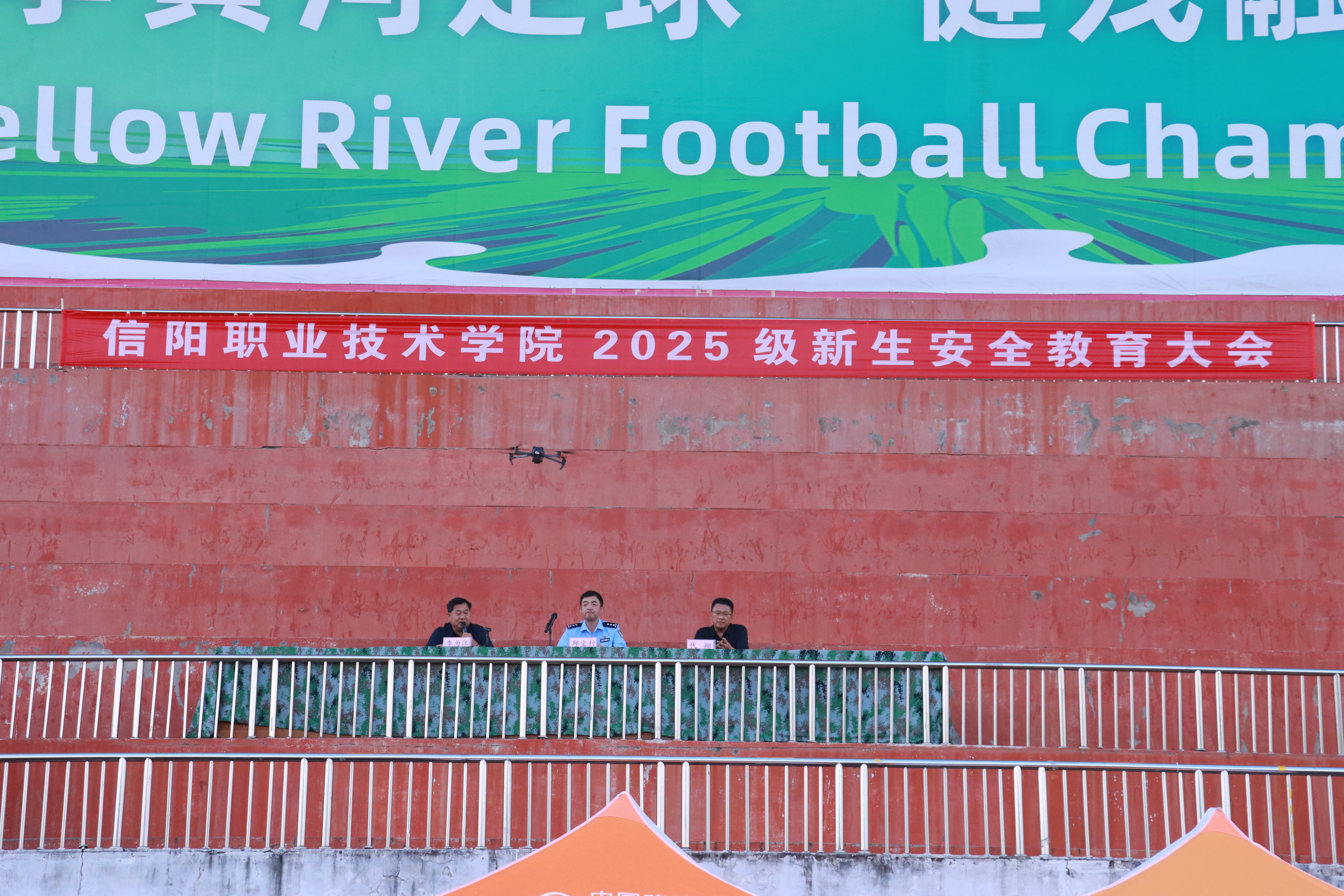 为增强新生的法治安全意识,筑牢安全防线,营造人人学安全,人人懂安全的氛围,9月24日下午,我校在体育场举行2025级新生安全教育大会。我校法治副校长、信阳市公安局羊山分局龙飞山派出所所长邱宝利,学生处处长代翔,安保处副处长李为江出席会议。