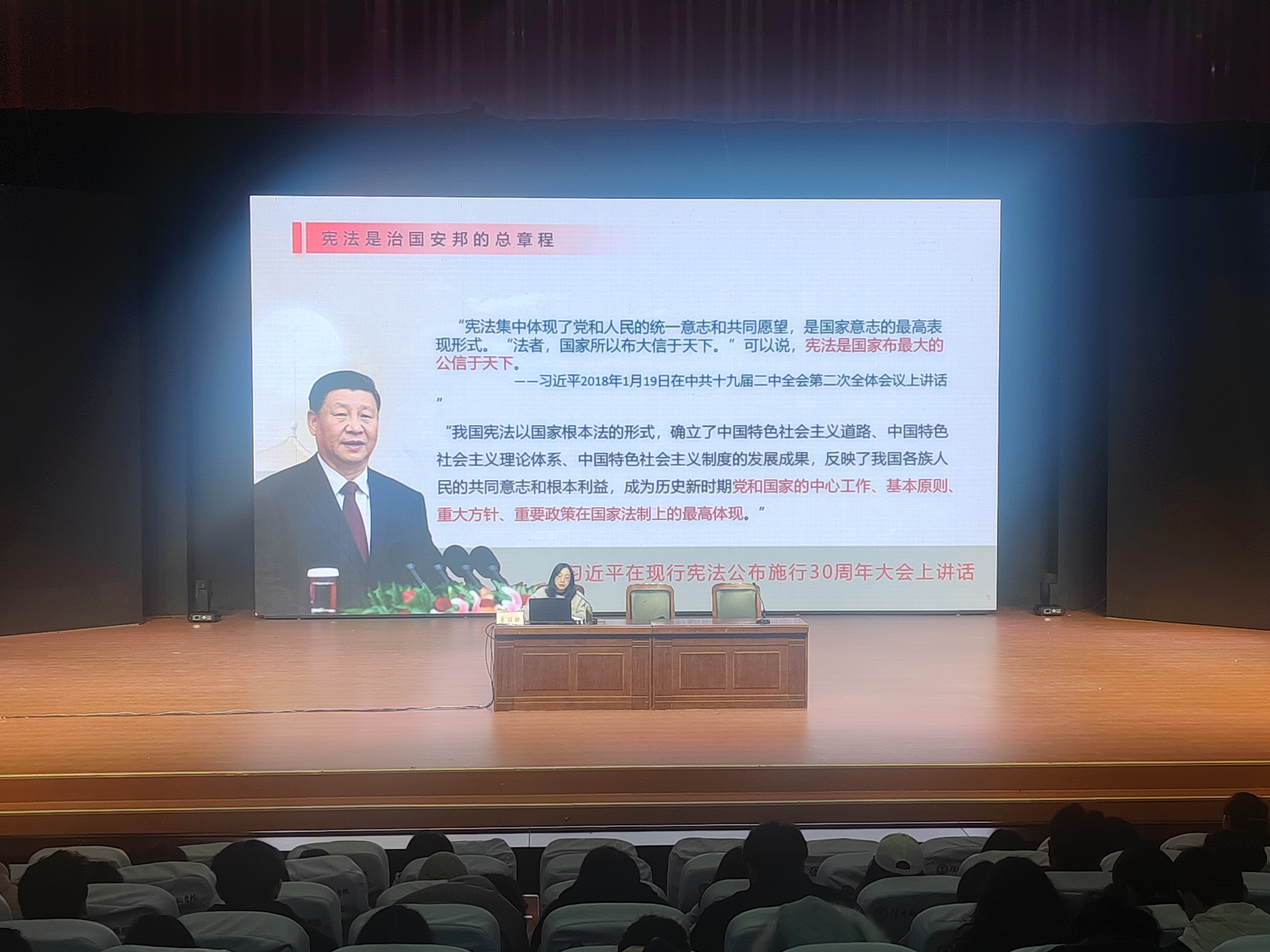 信阳市委党校法学教研室副主任易丽娅做了题为《深入学习贯彻习近平法治思想 大力弘扬宪法精神》的报告,她从国家宪法日的由来、新中国宪法的产生和发展、以习近平法治思想为指引,进一步弘扬宪法精神等几个方面,结合大量史实、案例,旁征博引、娓娓道来,讲座高屋建瓴、思想深邃,受到师生一致好评。