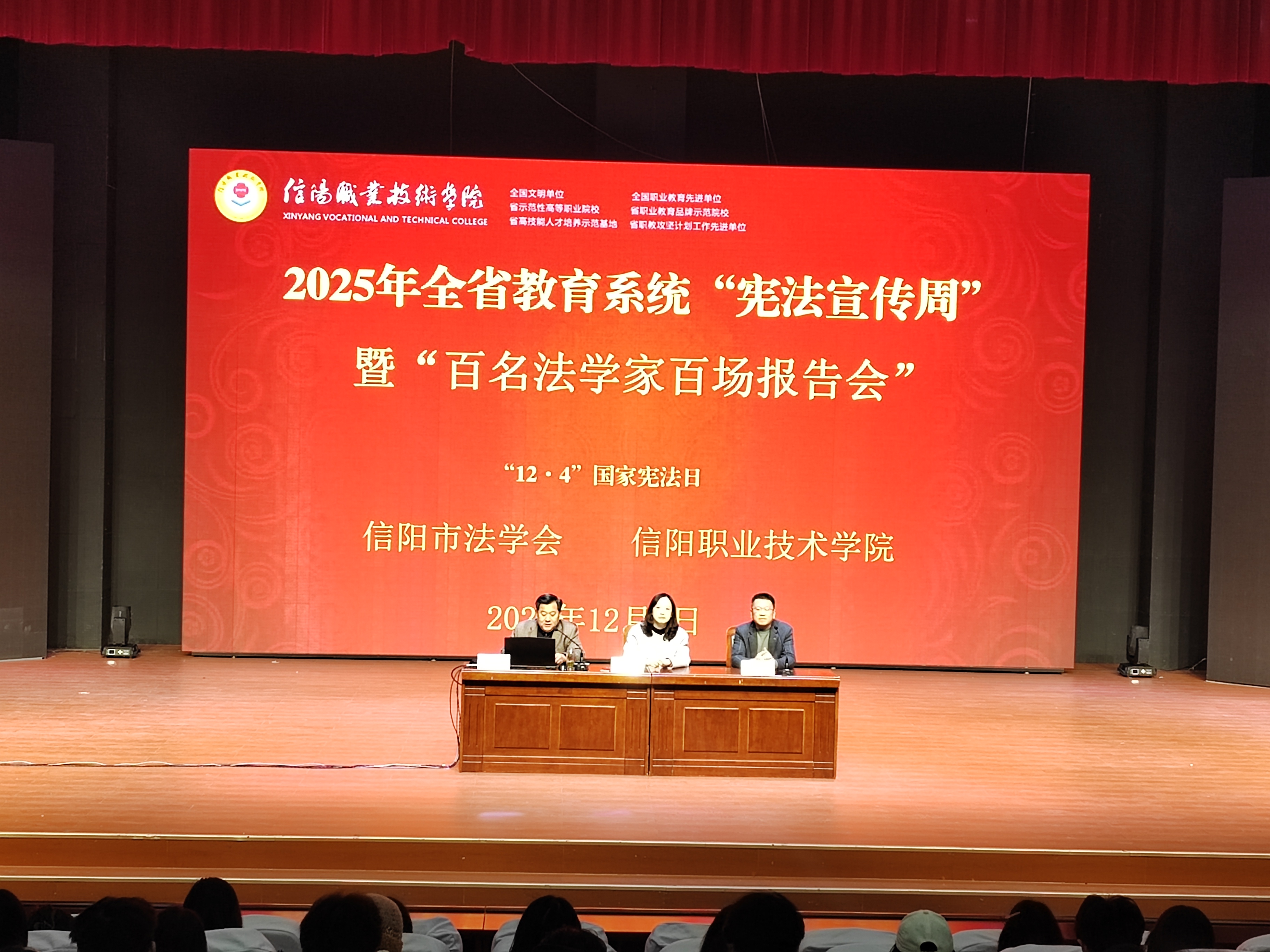 今年的12月4日是我国第十二个国家宪法日,为深入学习贯彻习近平法治思想,12月4日,我校联合信阳市法学会在图书馆报告厅举办2025年“宪法宣传周”法治宣讲活动。各学院学工干部、辅导员与学生干部等800余人聆听了报告。